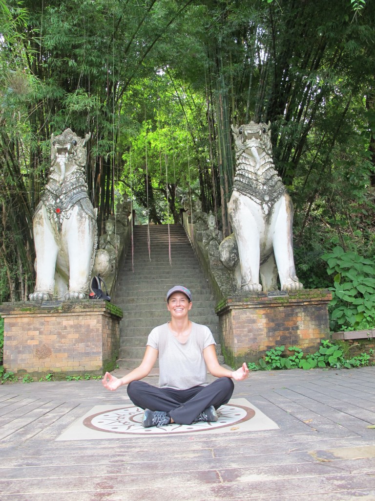 Monday came and I was ready for some action. I did some googling and found a cool hike up to one of the most famous temples in Chiang Mai called Doi Suthep. It was a bit out of the way and it required some under cover directions I found online, but I made it. The hike started and was fairly easy. The first part led up to a beautiful temple in the woods called Wat Phra Lat. The look out from there over Chiang Mai was beautiful and the grounds were stunning. Then up another mile or so, straight up, to the next temple and final destination. That was a bit more tricky. It was HOT, I was sweaty, and there were a lot of mosquitos. I lathered on the DEET bug spray but between the sweat and the rain, that was a losing battle. I hike for about an hour, wondering if I’d ever make it to the top. Finally, I crested up a hill and was at the junction of the trail and a road. I was sure I was at the top but when I pulled out Google maps, I had another 0.5 miles to go! I followed Google maps up a path and ended up at someone’s house-oops. That was clearly not the way to go. Tired, hungry and thirsty, I headed back down and hiked up the main road. I got to a little town and was excited to grab a soda water and a bag of Nori flavored Lays to rehydrate and salinate my body. Then I hiked up the rest of the way. The temple was at the top of another 300 or so steps. I arrived around 5:30 PM in the last hour of day light. The rain had just let up and a beautiful rainbow was coming into view over a lookout point. I stayed at the temple until dark-viewing the temple in the light of day and the dark of night was a treat. Bearing witness to the day, leading into night, the sunsetting and the beauty of the sky losing light was epic (and great for photos). Around night fall, the monks come into the temple and chant and pray. It’s a magical time to be present and witness this act of spirituality and reverence for Buddha.