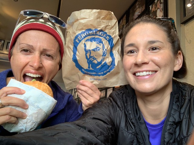 We arrived in a windy and chilly Queenstown. It was 35 degrees Fahrenheit (this must be clarified while traveling in this part of the world…the metric system is used here and when you report a temperature, it is assumed that you are reporting in celcius…so remember your F to C calculation!). We were not very well prepared for the cold-two SoCal girls expecting summer in the South of NZ. We learned quickly that the weather in this part of NZ is very variable and that it had just snowed the week before…so off we went to get Moini a more suitable coat (since I had only encouraged a fleece jacket to be brought along in her packed bag…oops).
